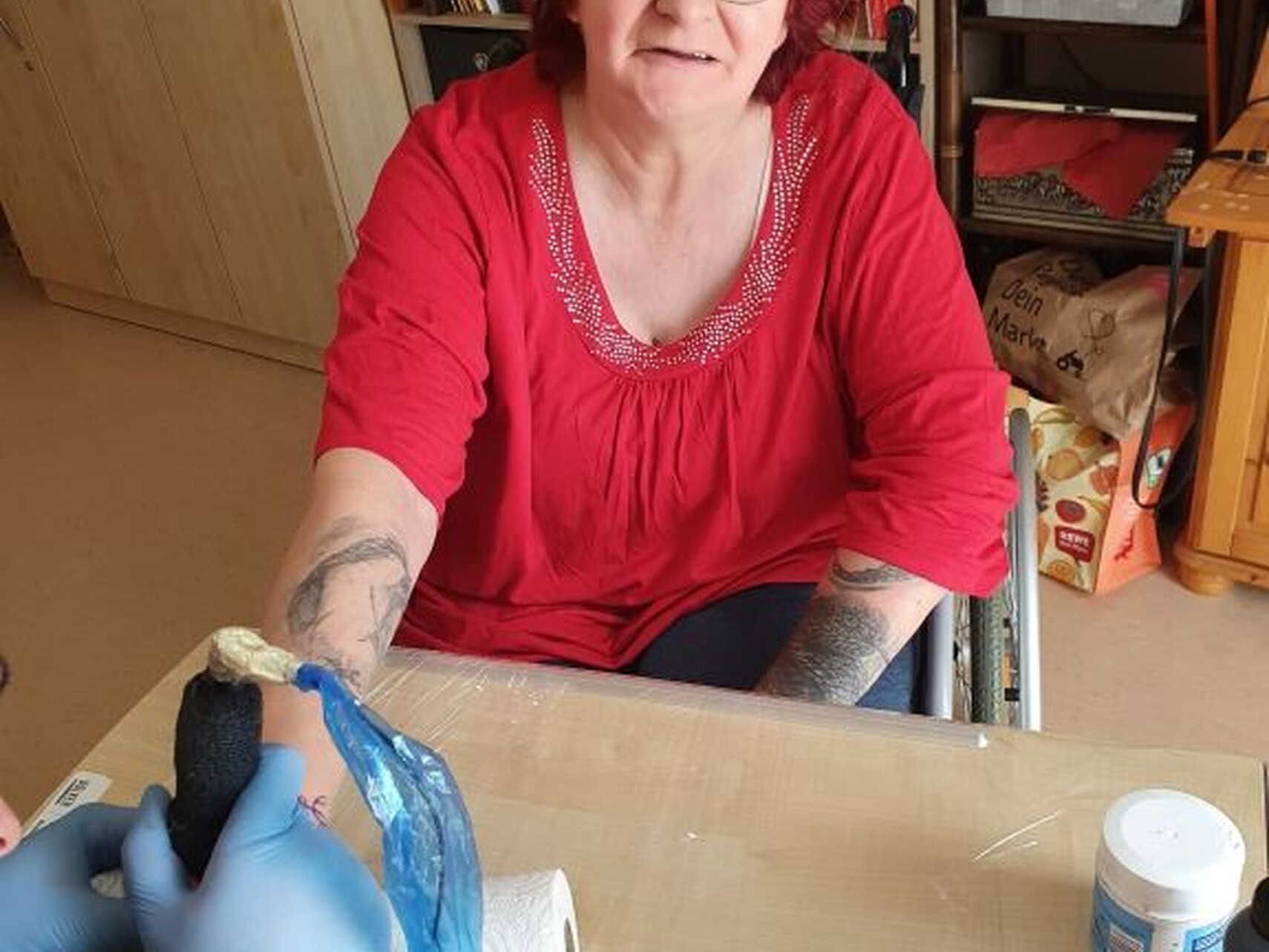 Unsere Soziale Betreuung erfuhr ganz zufällig von Heidruns Herzenswunsch. Ein Tätowierer unseres Vertrauens wurde gefunden und Heidrun überrascht. Überglücklich ließ sie sich das Wunschmotiv stechen.