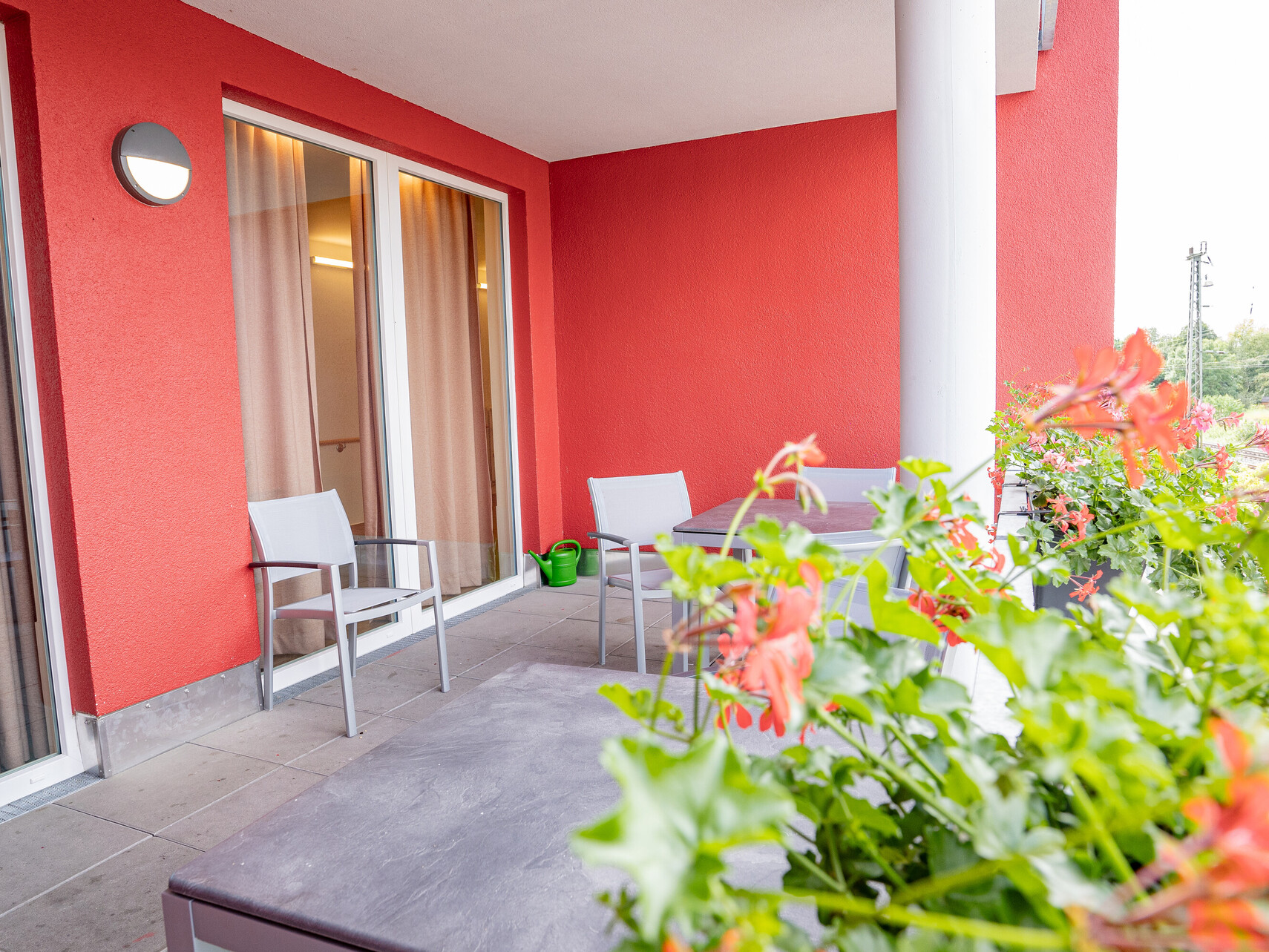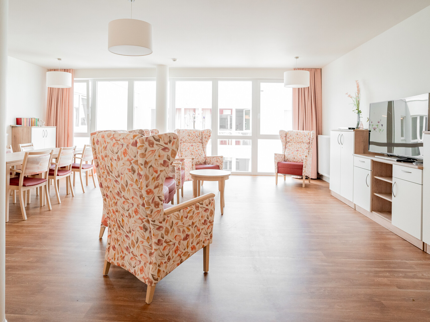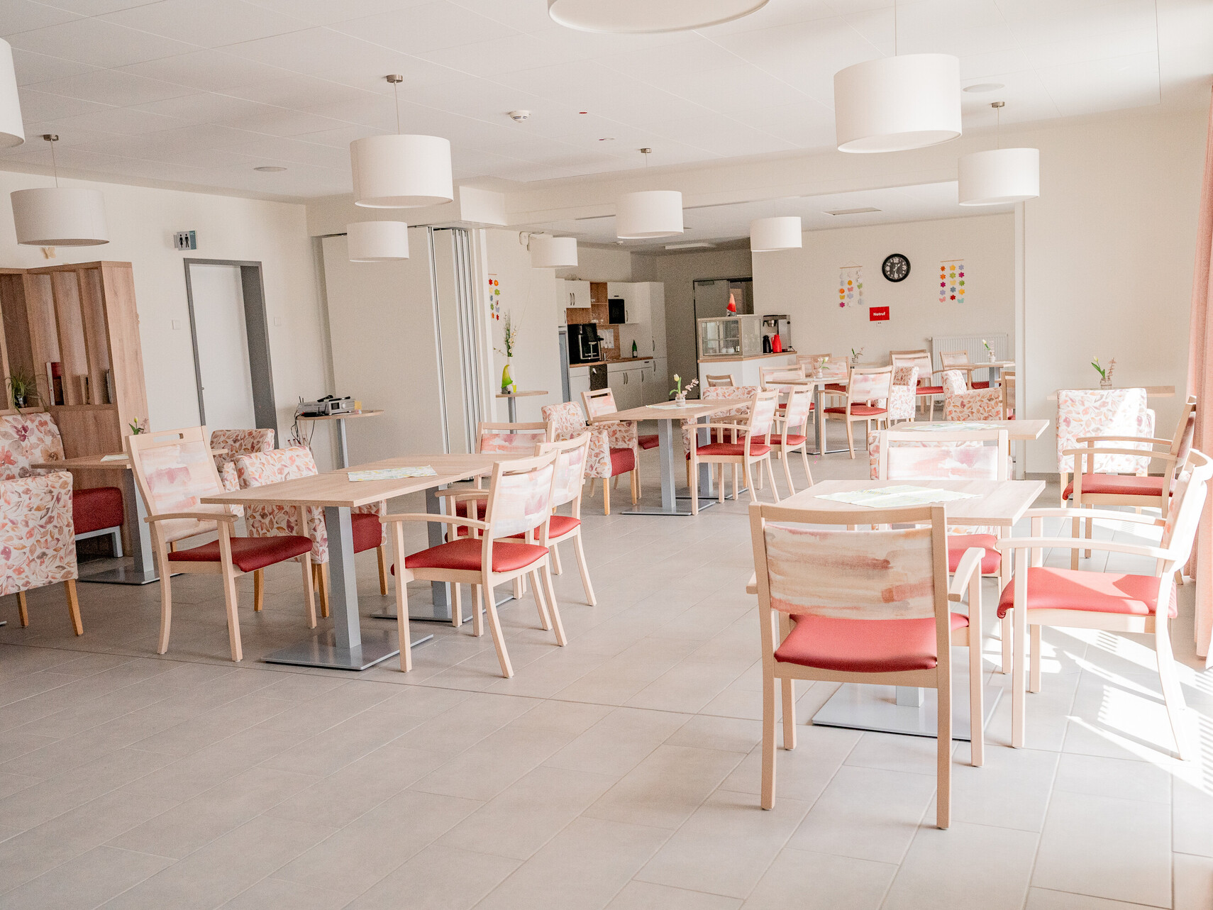 Unsere Wohnanlage hat 91 Plätze, aufgeteilt in 3 Wohnbereiche. Die Zimmer sind hell und modern eingerichtet und natürlich mit Notrufanlage, Telefon, Kabelanschluss, WLAN und rollstuhlgerechter sanitärer Einrichtung ausgestattet. Ein multifunktionaler Begegnungsraum mit Kino, die großzügigen Wohnküchenbereichen und eine große Sonnenterrasse stehen allen Bewohnerinnen und Bewohnern zur Verfügung.