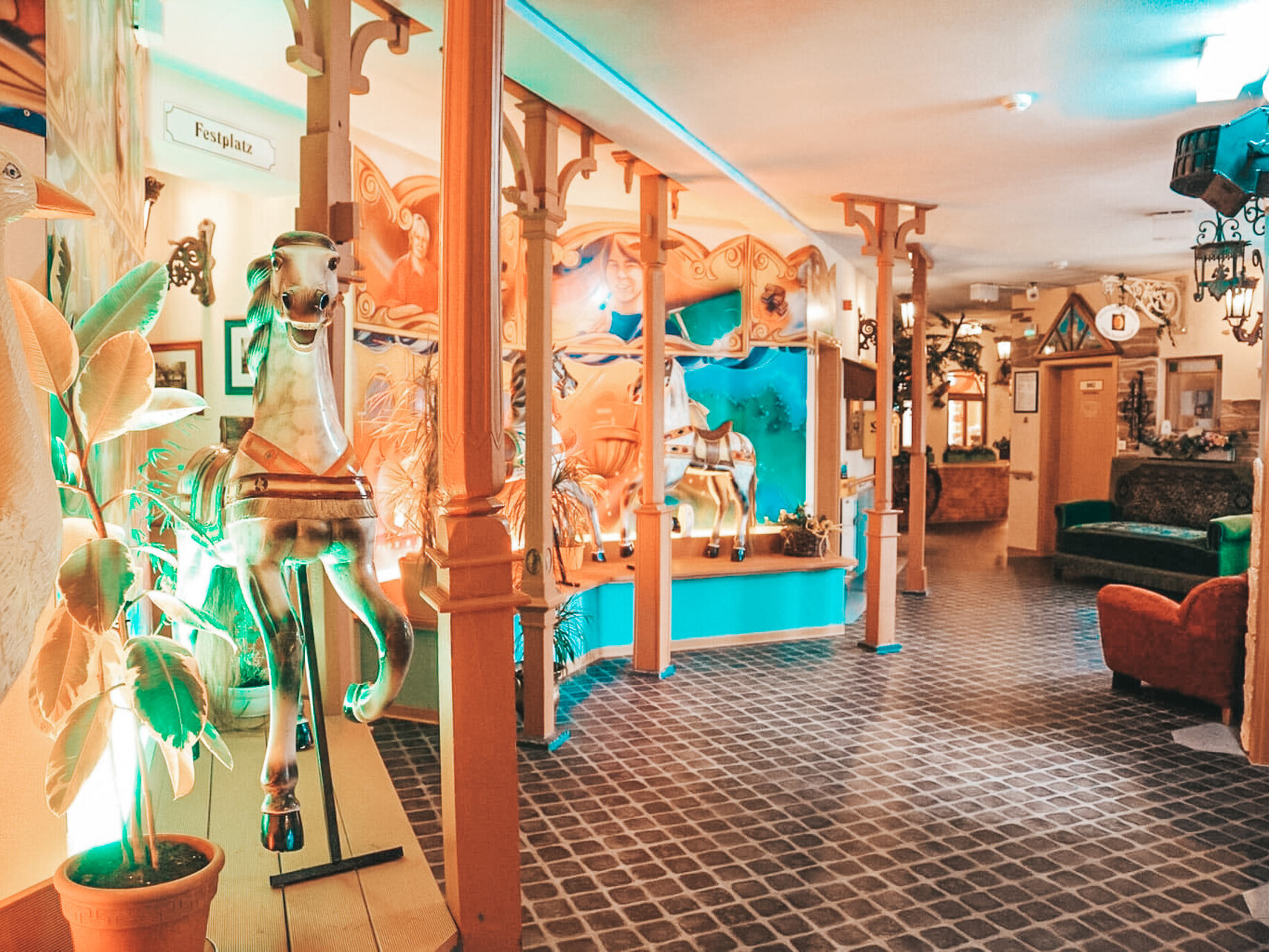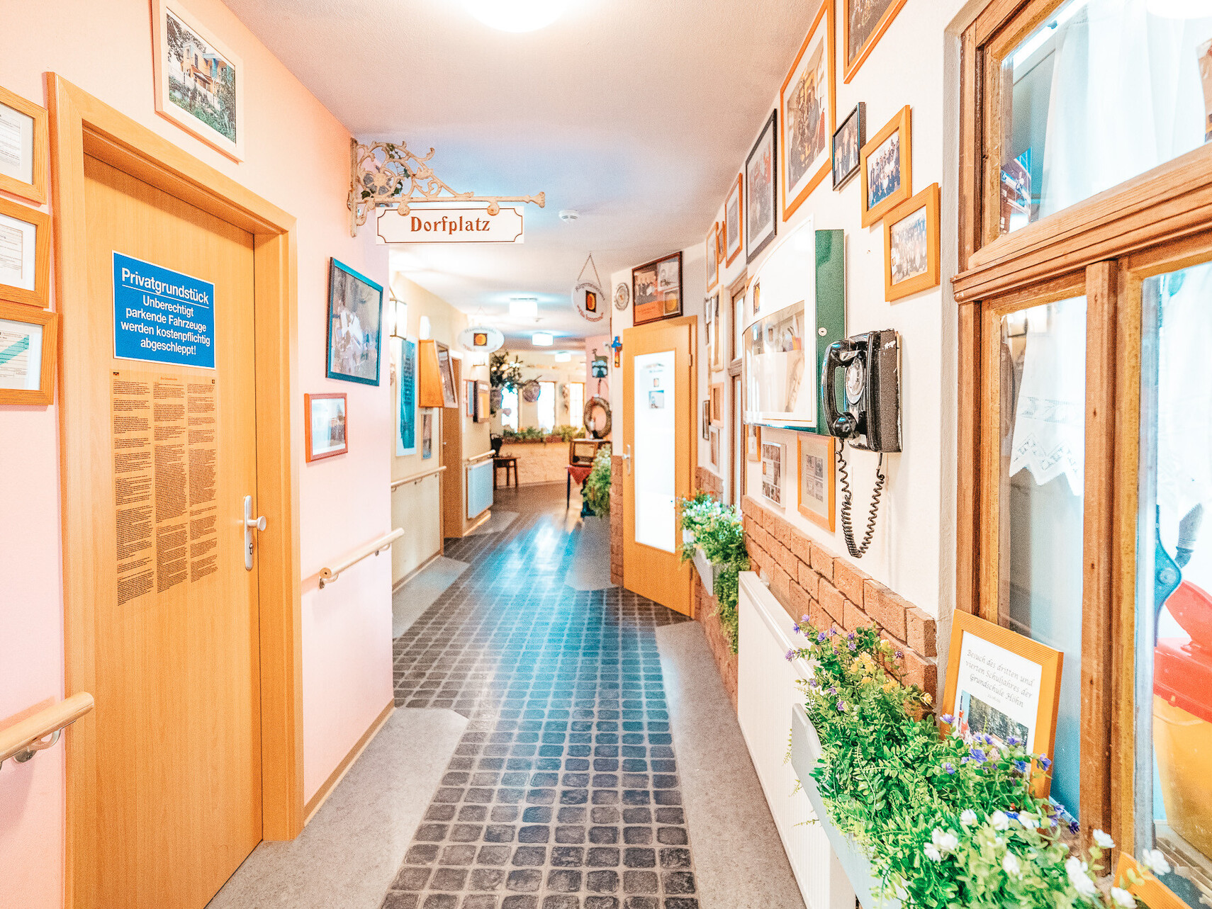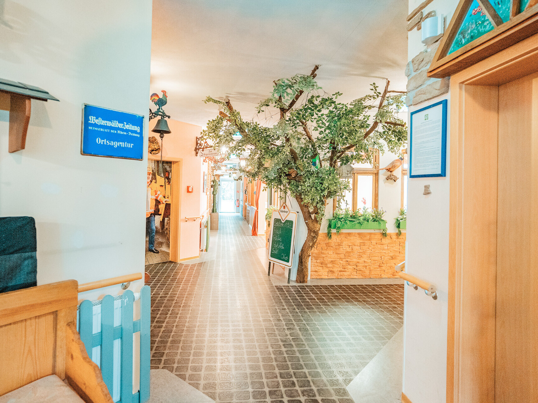 Karussellpferde im Seniorenheim? JA! Das home Neustadt präsentiert sich als ein eigenständiges Dorf in der Gemeinde Neustadt im Westerwald. So finden Sie eine Post, ein Kino, einen Rummelplatz mit echtem Kinderkarussell, einer Kneipe, Fahrschule, Bank, einem alten Dorfladen, Bahnhof, Friseurladen, Bürgermeisteramt und das Haus der „Gemeindeschwester“. Im Außenbereich gibt es eine Kapelle, das Gasthaus „Zum grünen Ast“ und einen kleinen Dorfsee.
