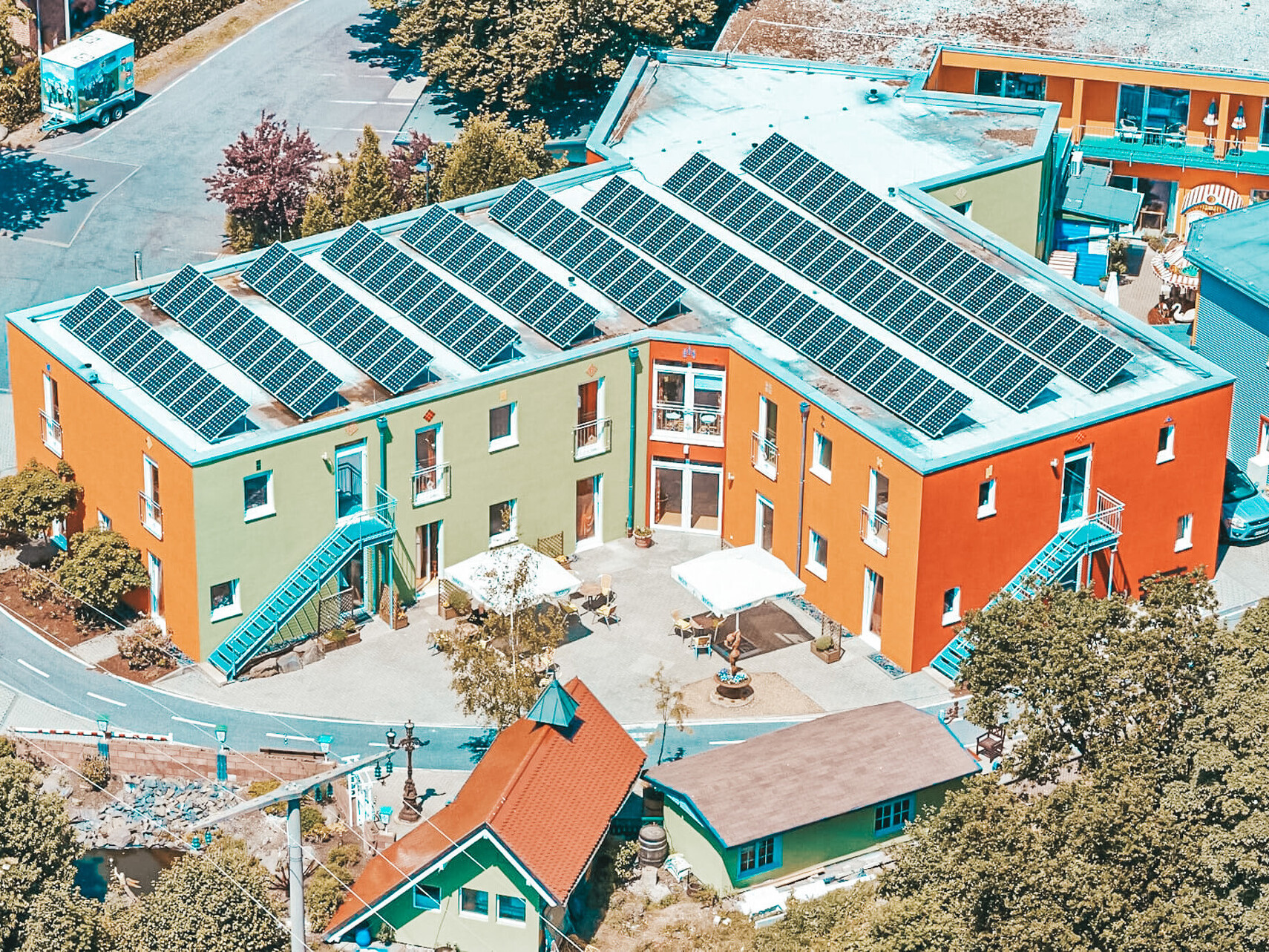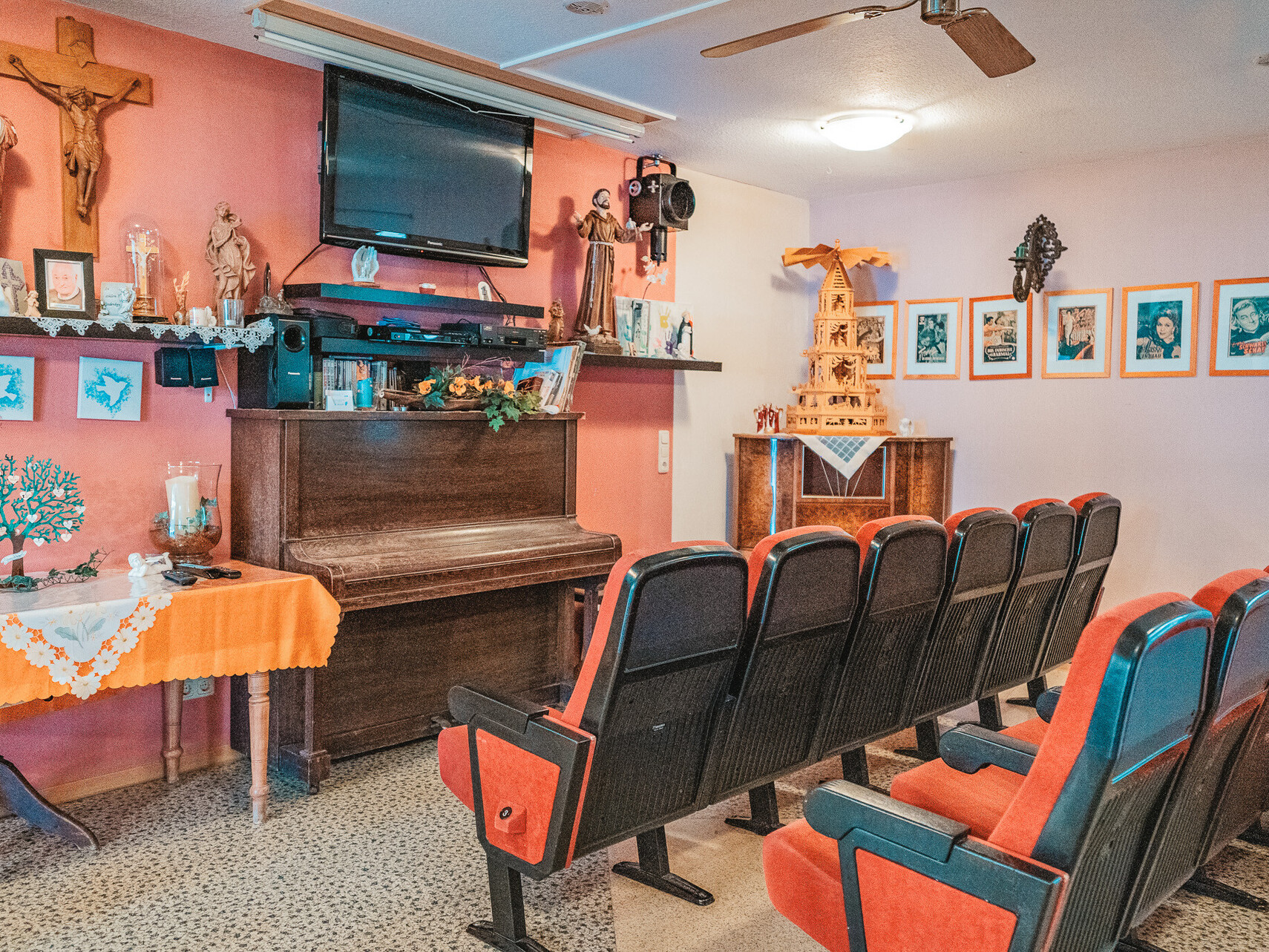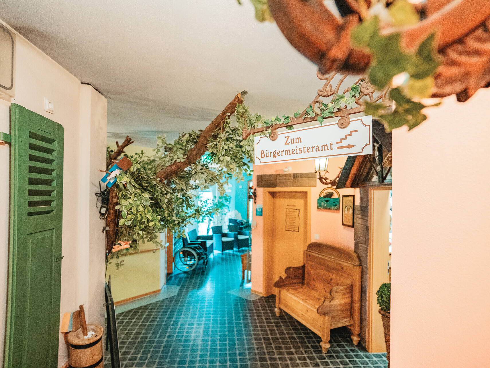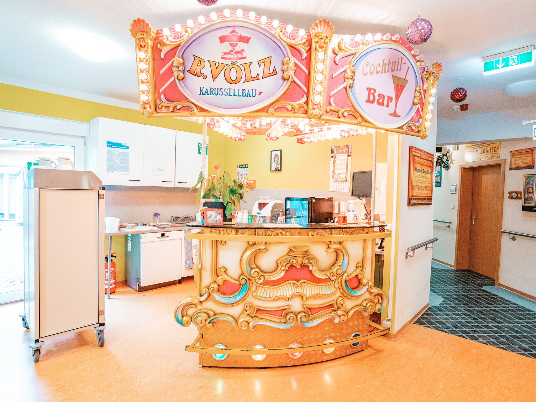 Karussellpferde im Seniorenheim? JA! Das home Neustadt präsentiert sich als ein eigenständiges Dorf in der Gemeinde Neustadt im Westerwald. So finden Sie eine Post, ein Kino, einen Rummelplatz mit echtem Kinderkarussell, einer Kneipe, Fahrschule, Bank, einem alten Dorfladen, Bahnhof, Friseurladen, Bürgermeisteramt und das Haus der „Gemeindeschwester“. Im Außenbereich gibt es eine Kapelle, das Gasthaus „Zum grünen Ast“ und einen kleinen Dorfsee.